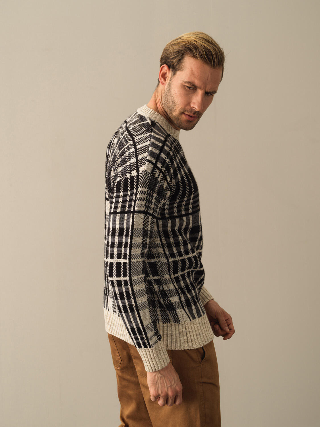 Crew Neck Oversized Checked Sweater