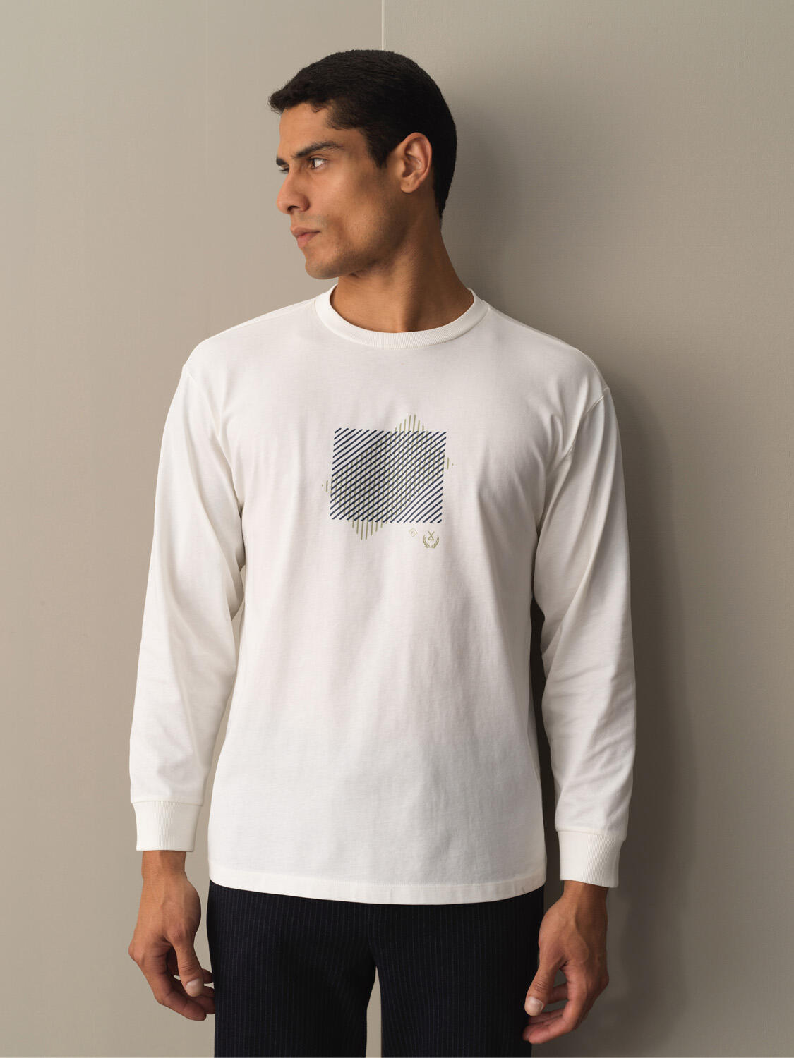 Ecru Cotton Textured Regular Fit Long Sleeve T-Shirt - Xint