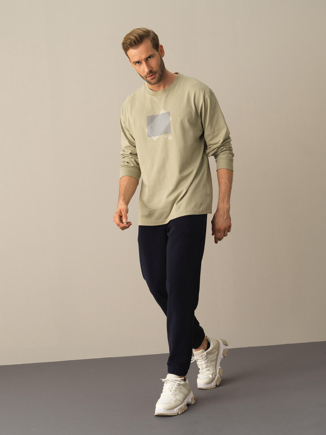 Ekru Pamuk Dokulu Regular Fit Uzun Kollu Tişört - Xint