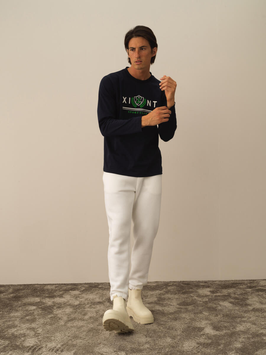 Navy Blue Modal Textured Slim Fit Long Sleeve T-Shirt - Xint