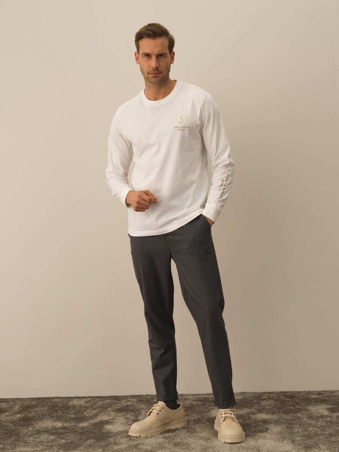 Ekru Pamuk Dokulu Regular Fit Uzun Kollu Tişört - Xint