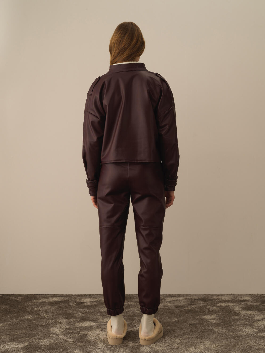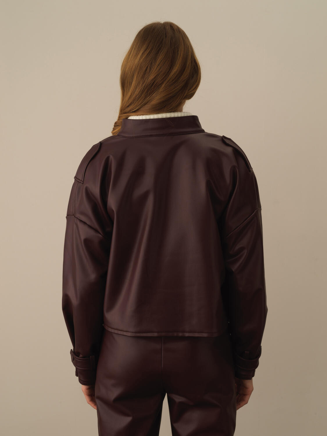 Bordo Deri Görünümlü Oversize Ceket