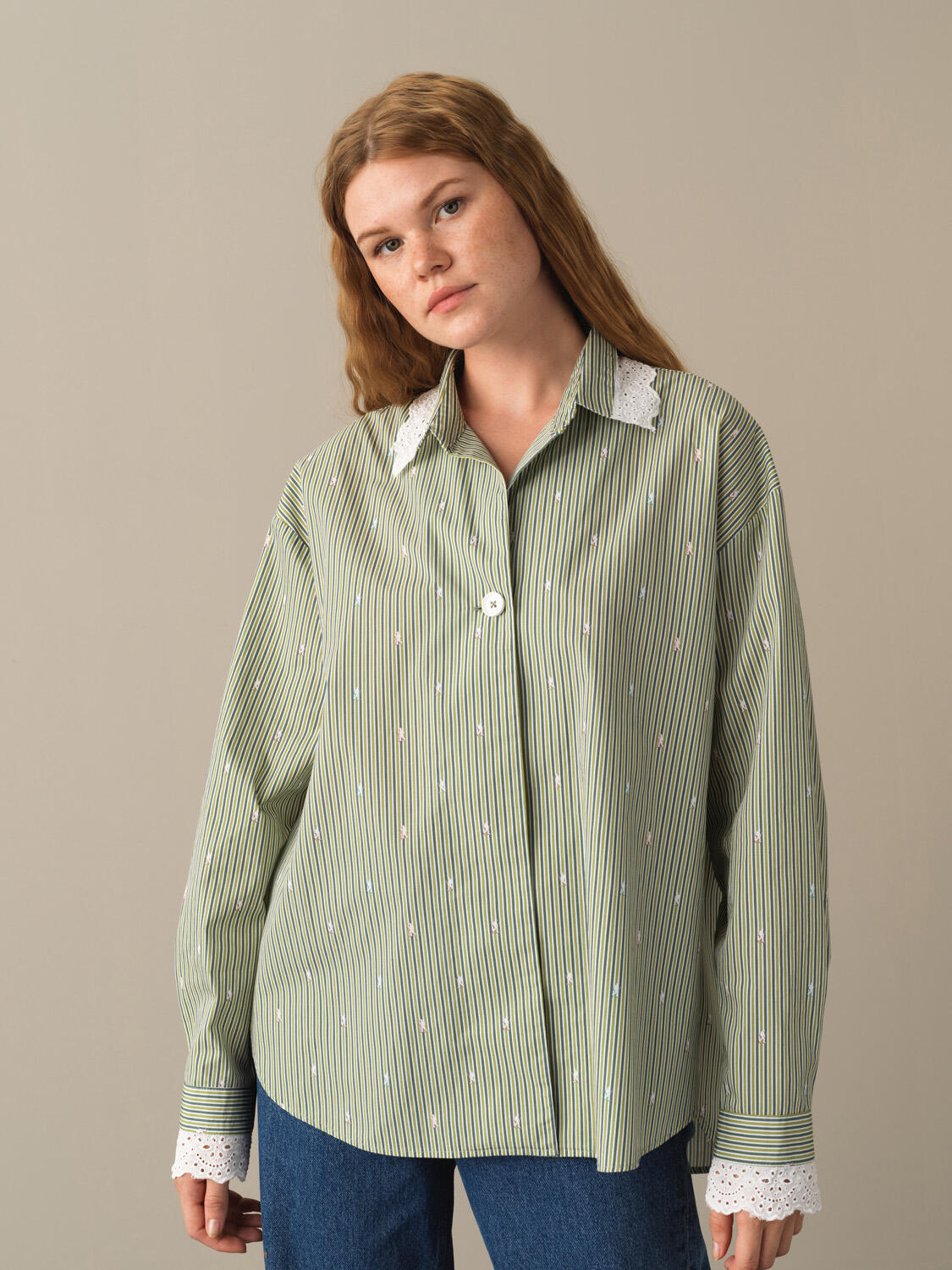 Yeşil Pamuk Dokulu Oversize Çizgili Gömlek