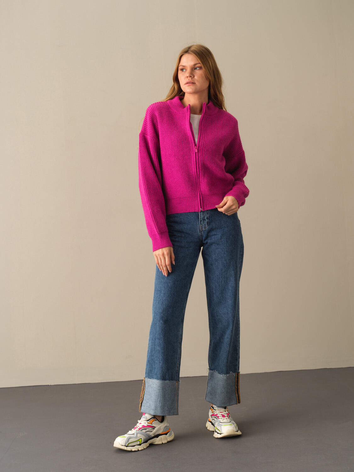 Fuşya Pamuk Dokulu Oversize Hırka