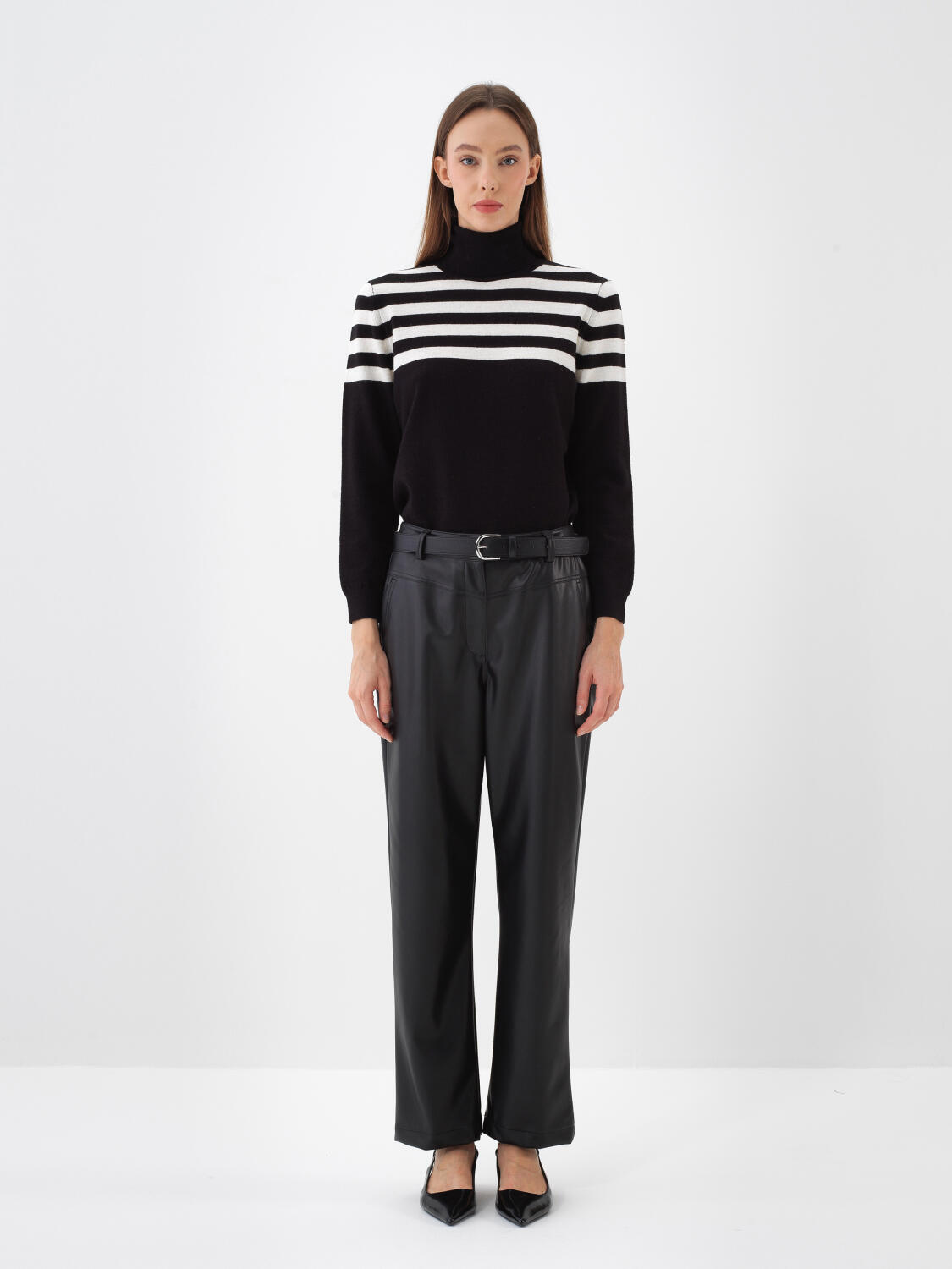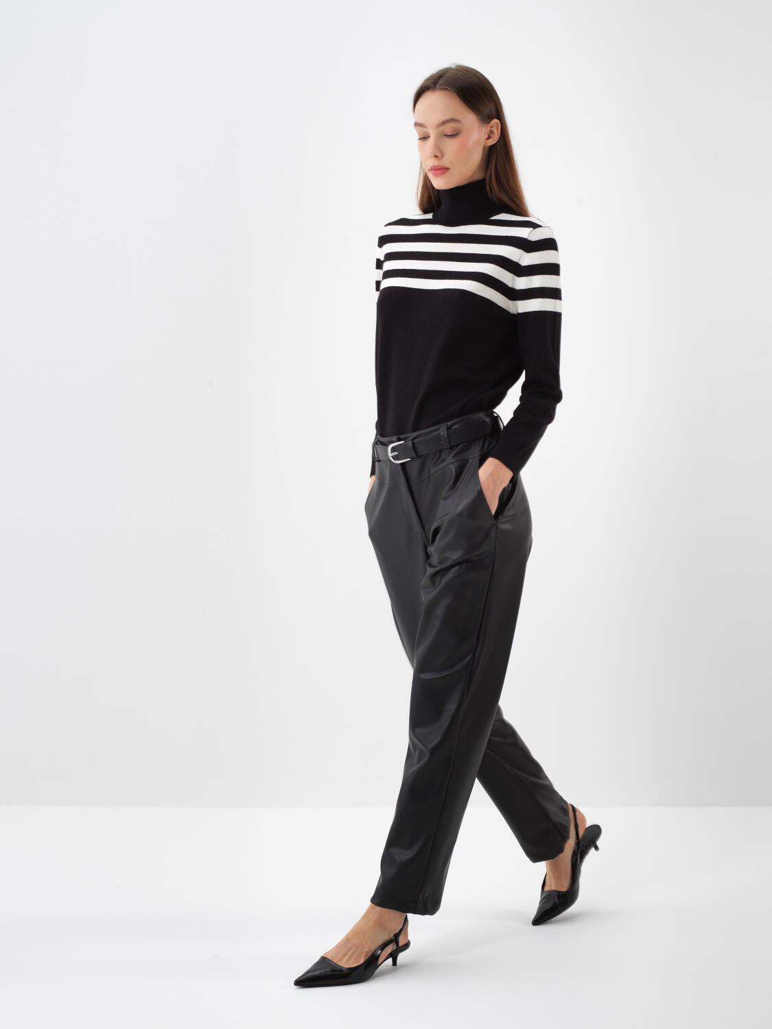 Siyah Deri Görünümlü Regular Fit Pantolon - Xint