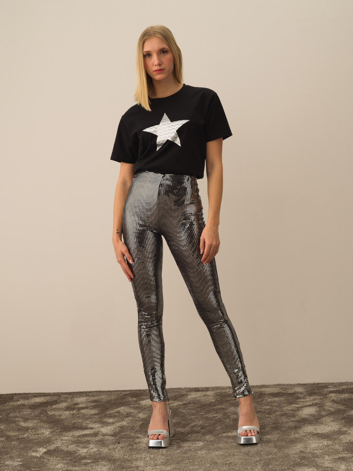 Ekru Esnek Dokulu Slim Fit Tayt