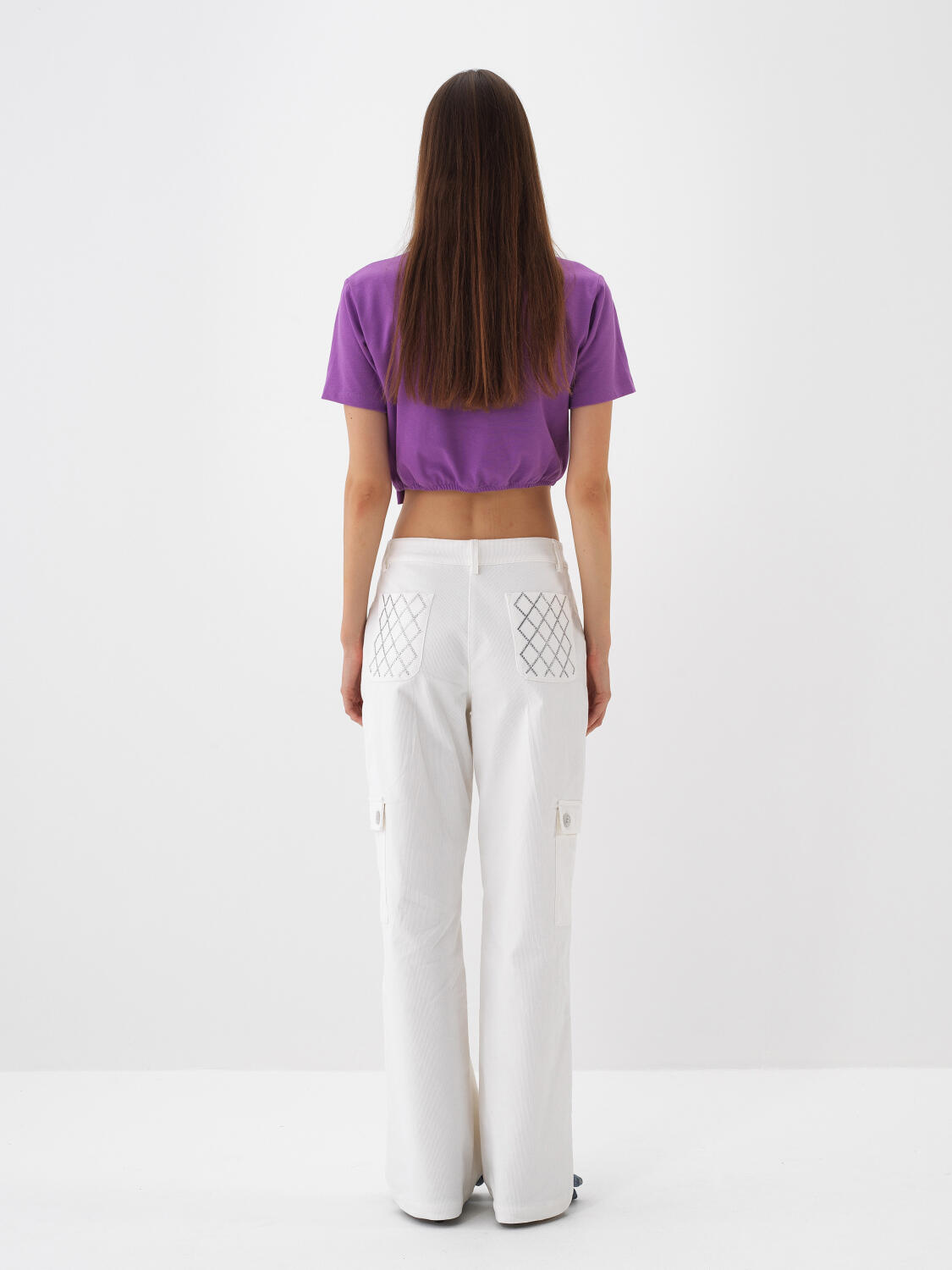 Beyaz Lüks Dokulu Soft Kadife Oversize Pantolon - Xint