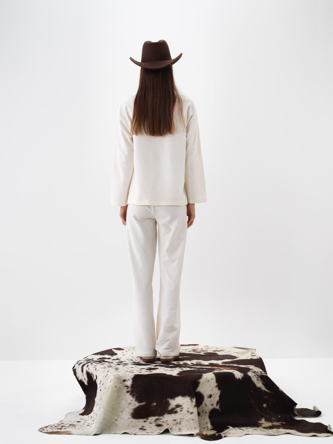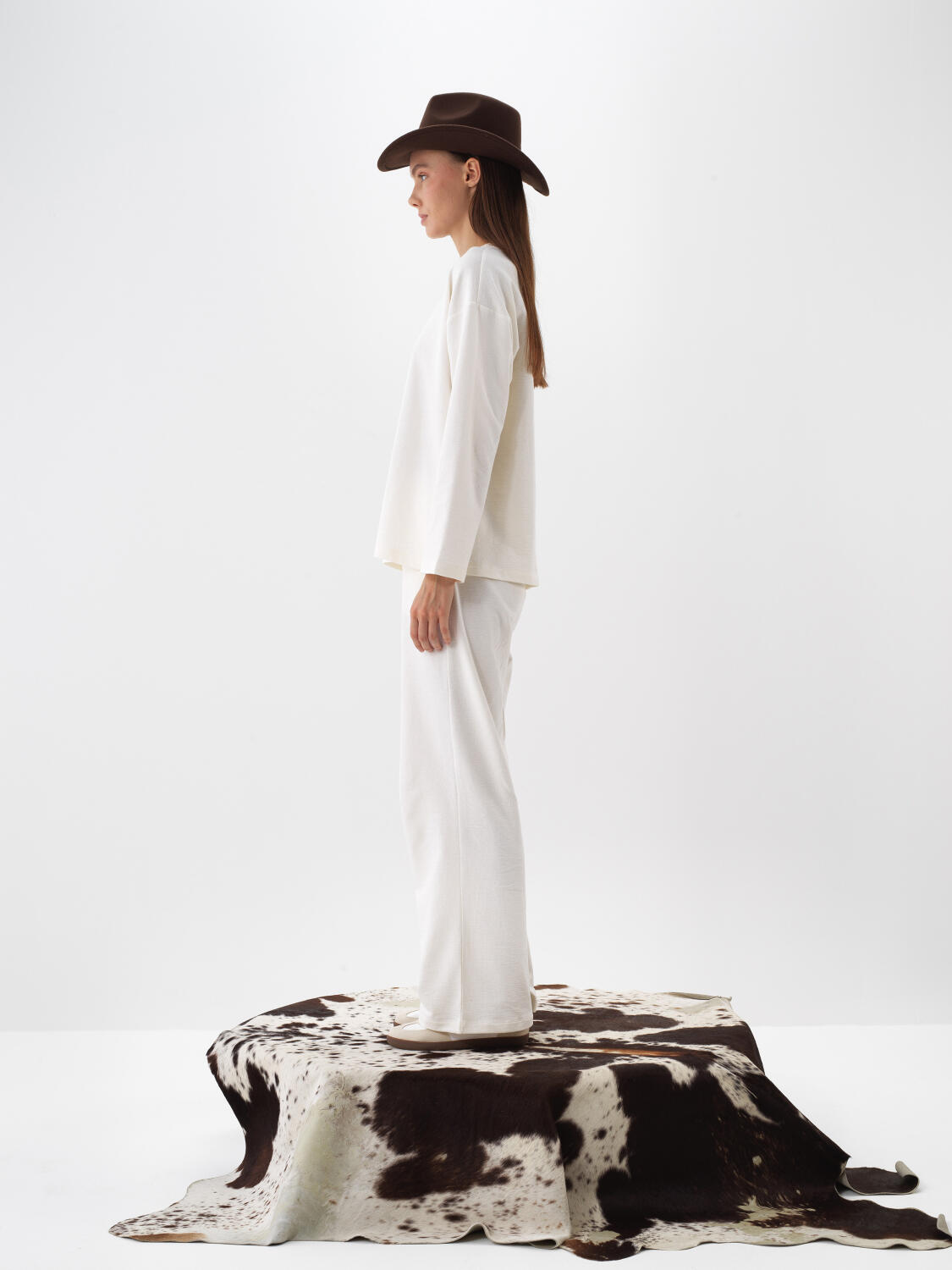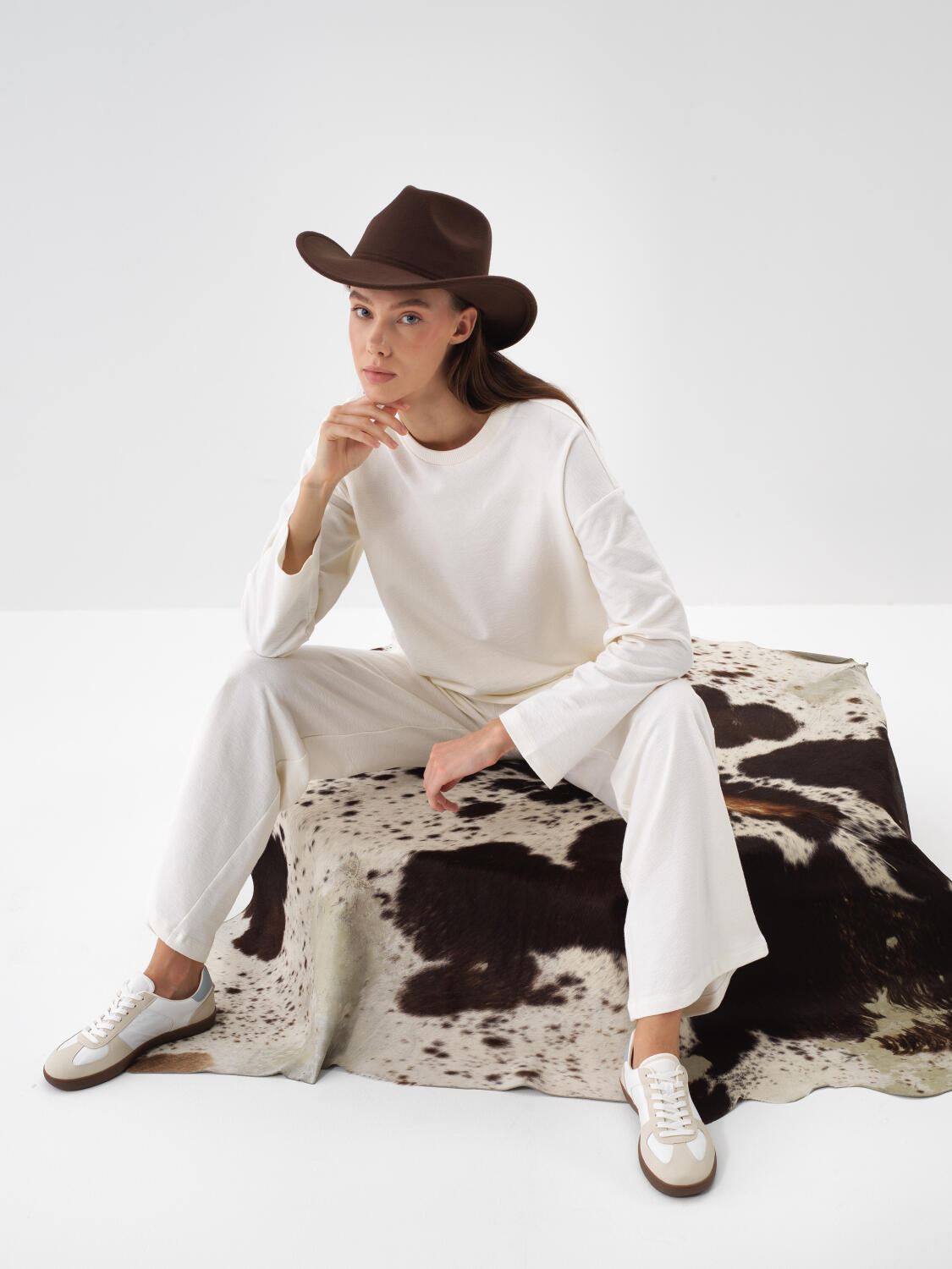 Ekru Pamuk Dokulu Oversize Uzun Kollu Tişört