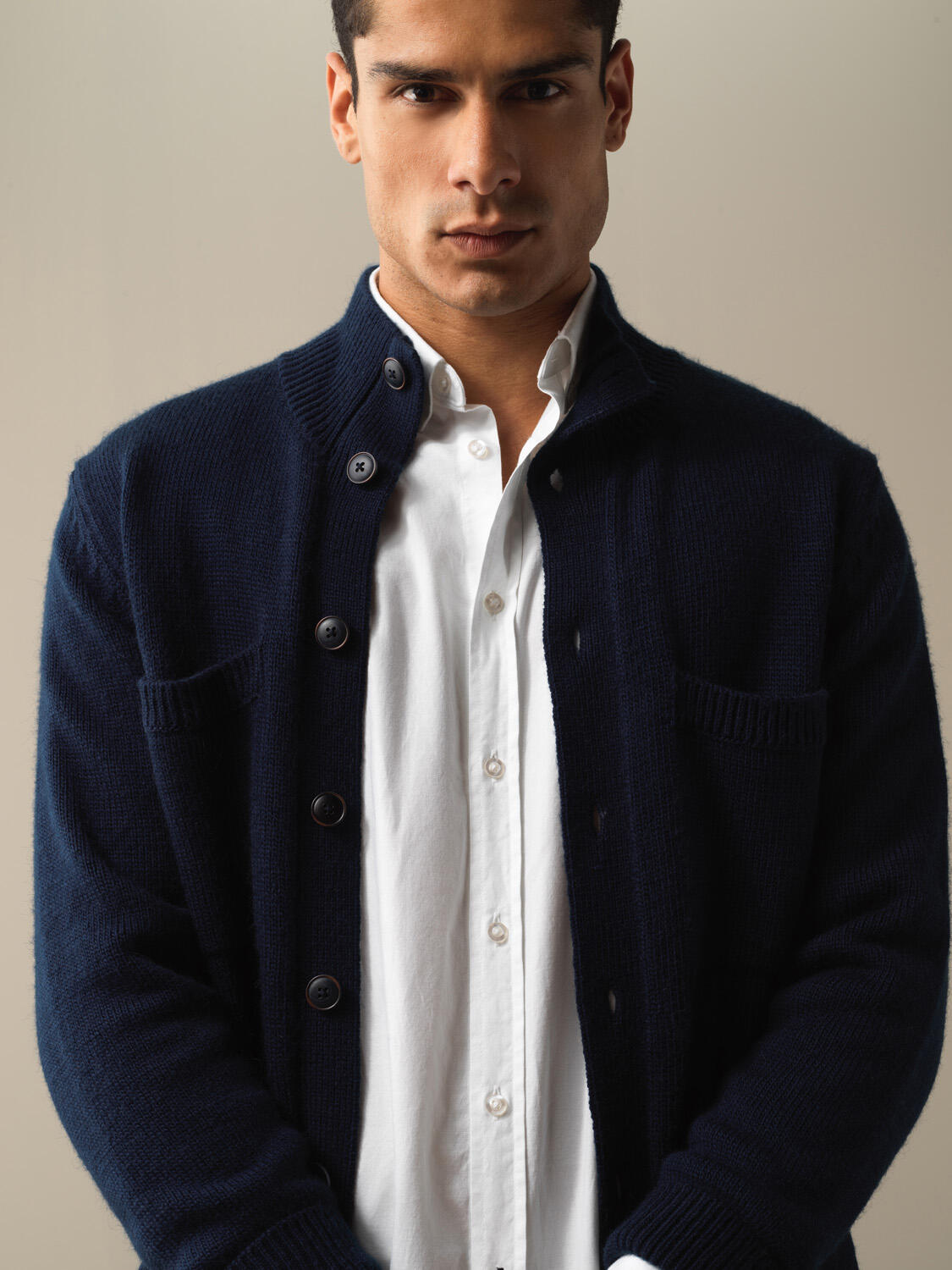 Navy Blue Natural Wool Textured Regular Fit Cardigan - Xint