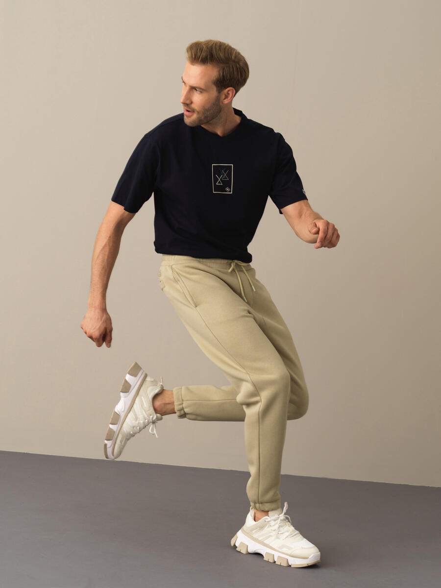 Navy Blue Cotton Textured Slim Fit Sweat Trousers - Xint
