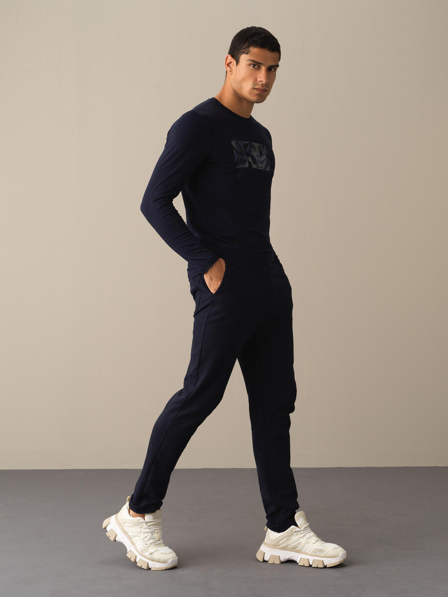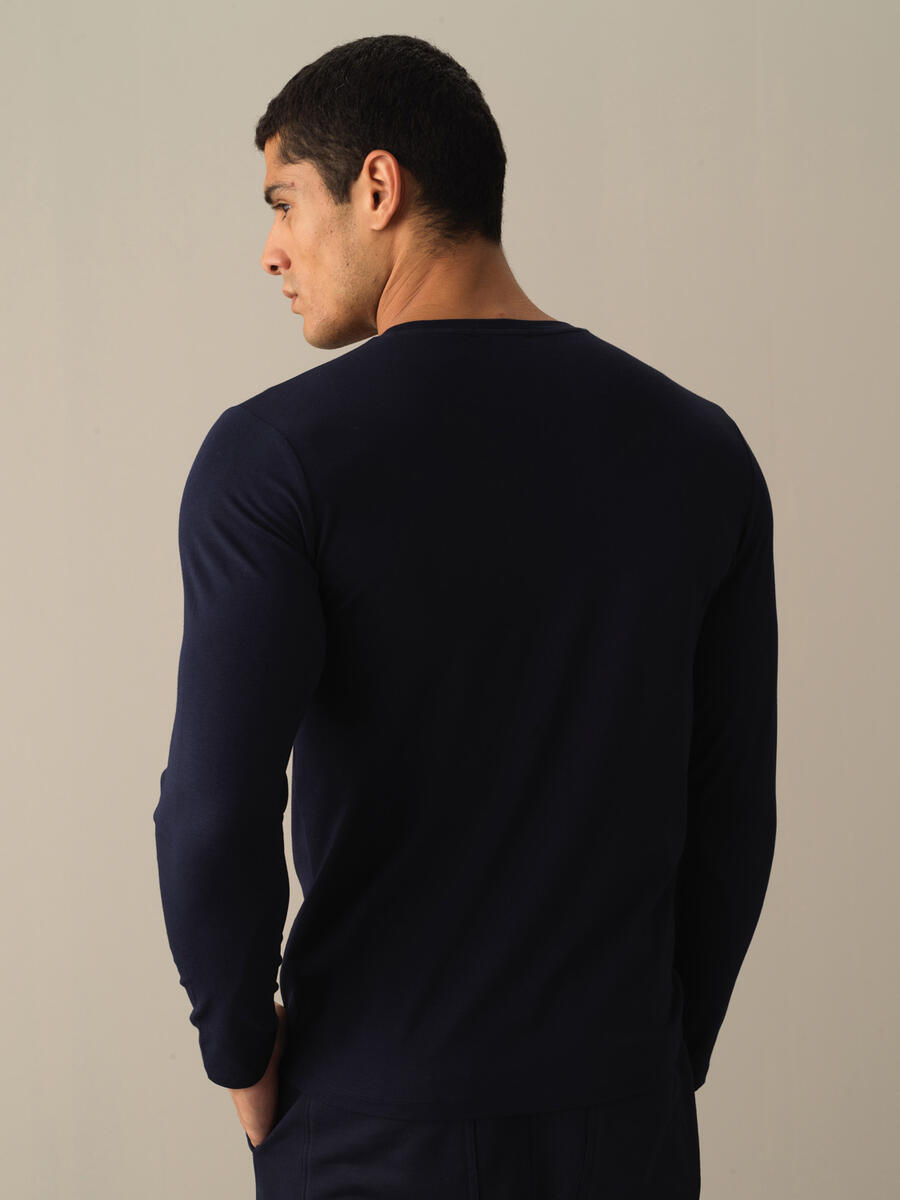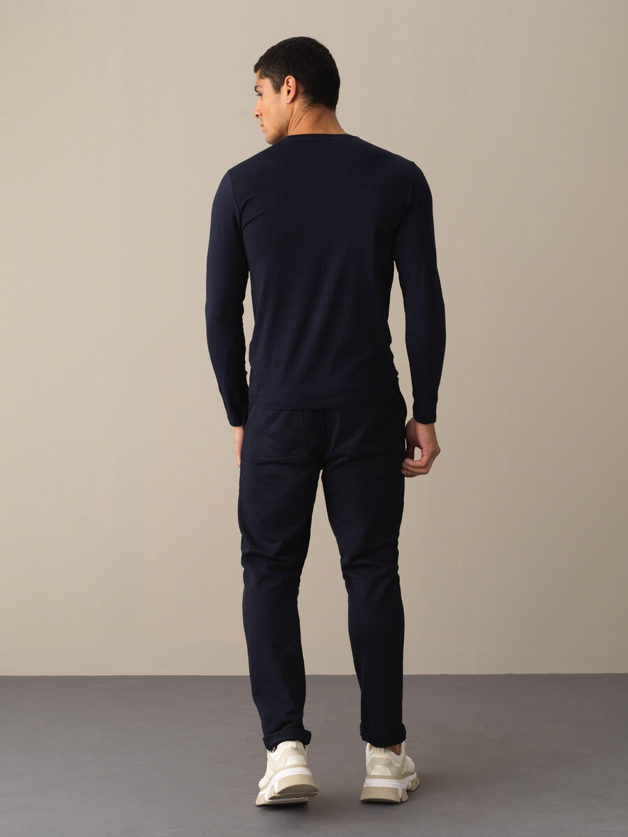 Navy Blue Modal Textured Slim Fit Long Sleeve T-Shirt - Xint