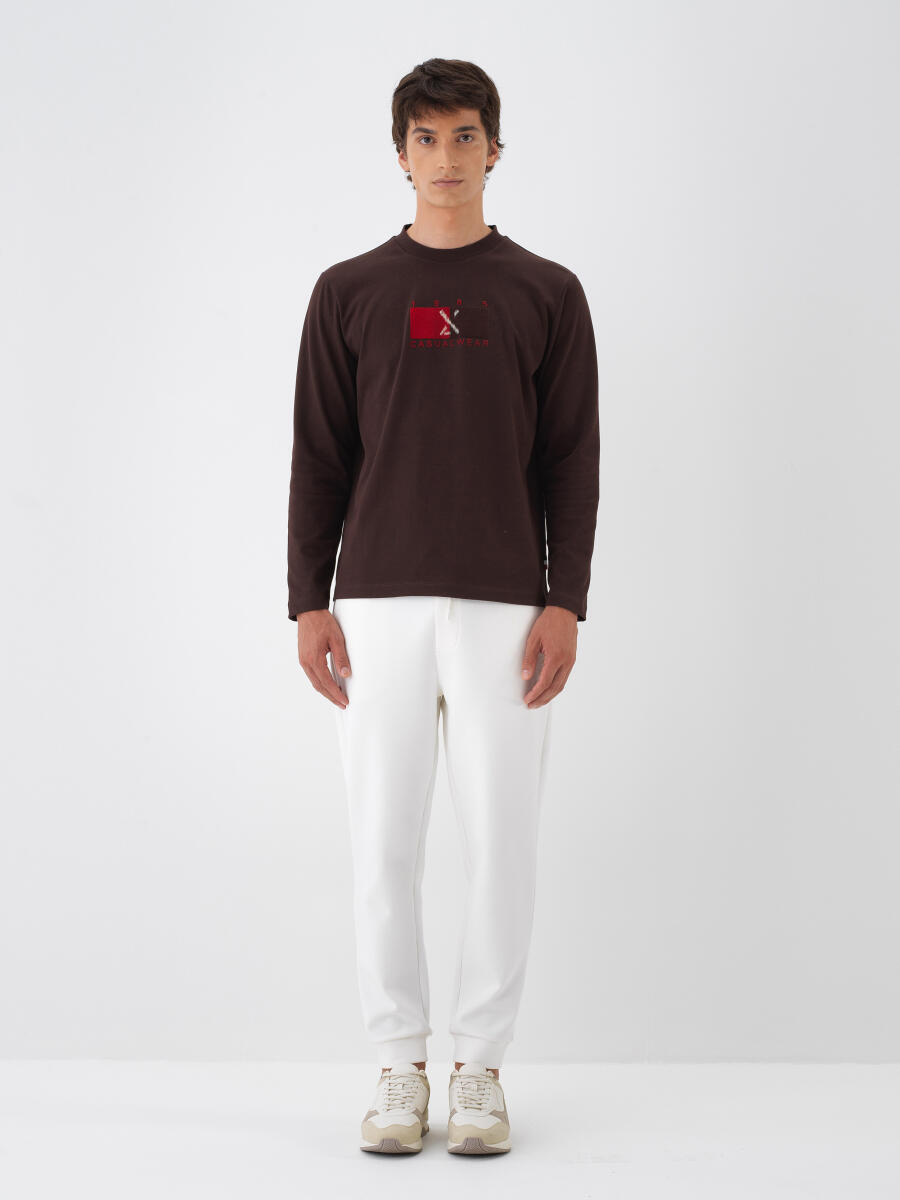Ecru Cotton Textured Regular Fit Long Sleeve T-Shirt - Xint