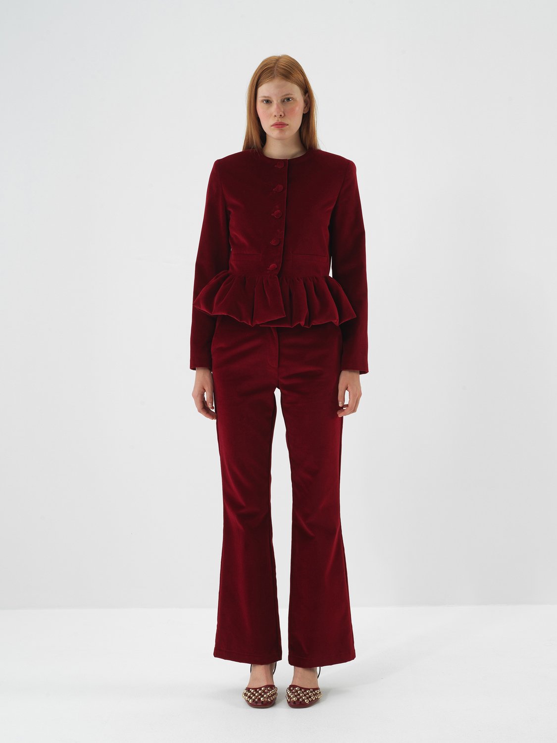 Burgundy Luxury Textured Soft Velvet Regular Fit Trousers